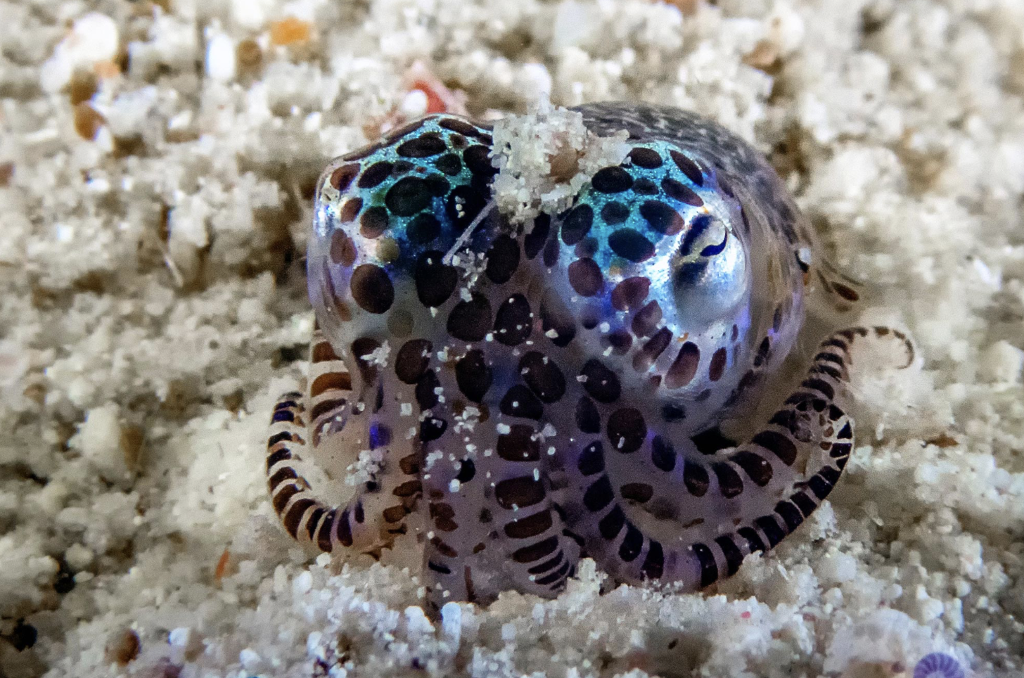 The squid in the picture is a tiny bobtail squid (of course it's not found in the cuisines), they are tiny marine invertebrates that are found throughout the world’s oceans. Have you ever wondered why they are blue in colour?